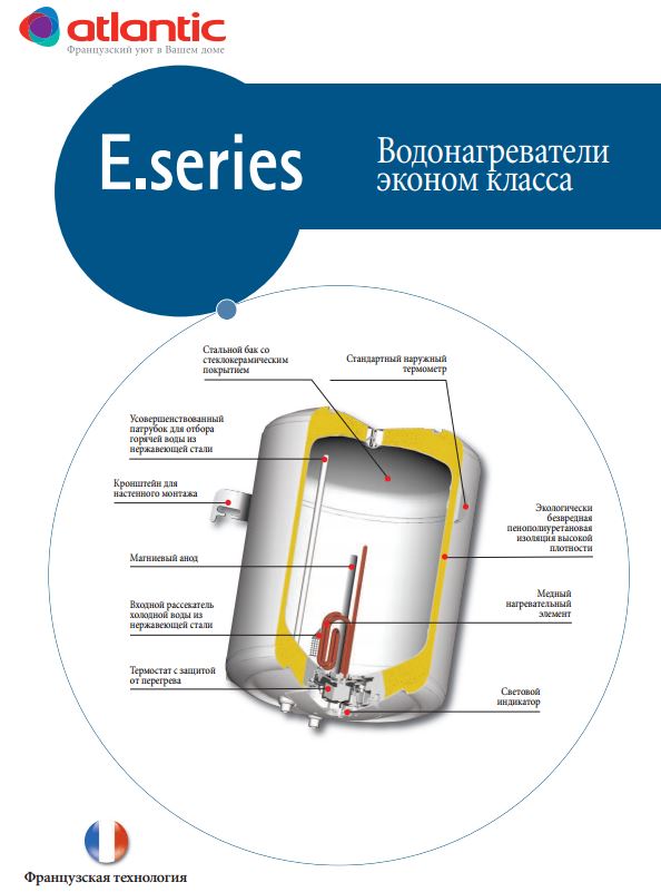 Наличие электрического нагревательного элемента высокой мощности позволяет устройству производить, нагрев воды в максимально сжатые сроки при незначительной нагрузке на электросеть. Нагревательный элемент и электрический блок имеют расположение на фланце. Это способствует лёгкому снятию элементов и значительному упрощению процесса ухода за устройством. Нагревательный элемент изготовлен из меди, увеличивающей срок его эксплуатации. Оснащение специальным предохранительным клапаном даёт возможность защитить устройство от избытка водяного давления и обеспечивает безопасное и бесперебойное функционирование устройства. Данный накопительный водонагреватель Atlantic имеет высокое качество и доступную цену. По этой причине бойлеры Round VMR представляют собой самое рациональное решение в вопросе приобретения устройства для бытового пользования и именно поэтому они снискать такую высокую популярность среди пользователей. Бойлер сочетает в себе все необходимые характеристики, присущие надёжному и качественному устройству: высокая производительность оборудования, компактность размеров, что позволяет размещать его в любом удобном месте, а техническое оснащение отвечает любым пожеланиям потребителей. Объёма бака достаточно для принятия душа, произведения уборки и мытья посуды, а экономичность расхода электроэнергии сохранит материальные затраты. Приобретая данный водонагреватель, вы присоединяетесь ко всем сторонникам комфорта и качества.