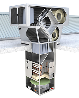Агрегаты MIRINE RСHP монтируются со стороны кровли в узел прохода. Нижняя часть агрегата с воздухонагревателем и вихревым воздухораспределителем Air-Distributor располагается внутри помещения, верхняя часть агрегата с центробежными вентиляторами и клапанами для забора и выброса воздуха располагается на кровле здания.