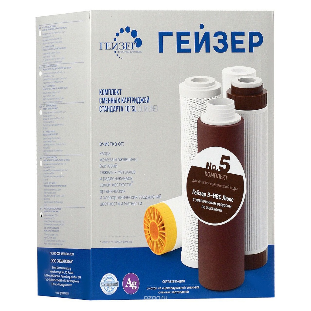 Комплект сменных картриджей 5 - включает набор из трех элементов для эффективной работы прибора. Подходит для проточных фильтров серии Гейзер ЗИВЖ для жесткой водопроводной воды.