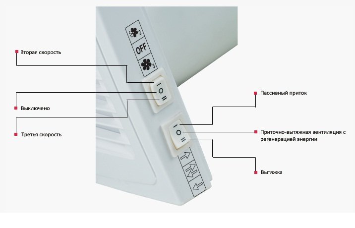 На корпусе проветривателя вынесены кнопки управления основными режимами, что делает работу установки еще практичнее и удобнее.